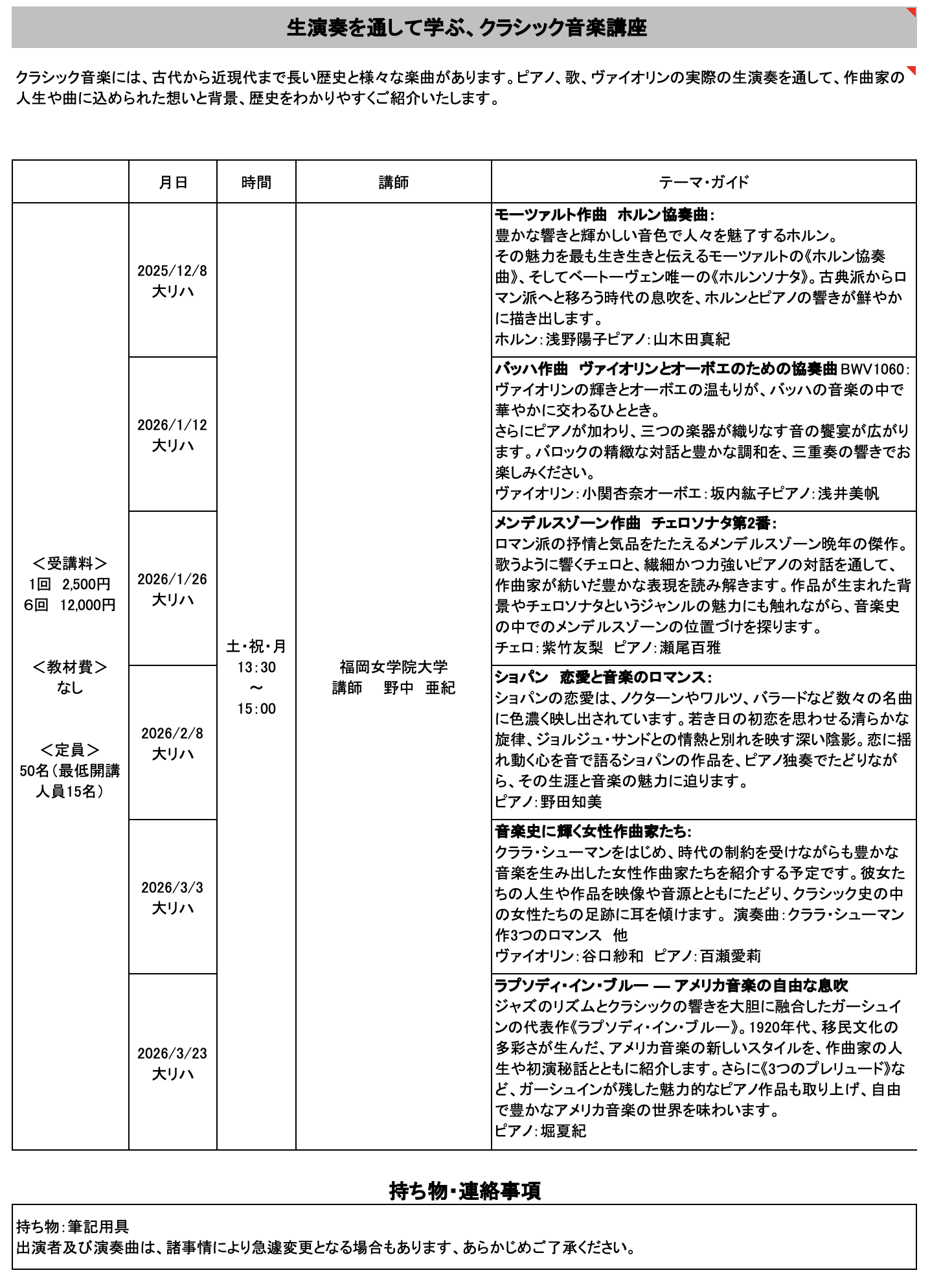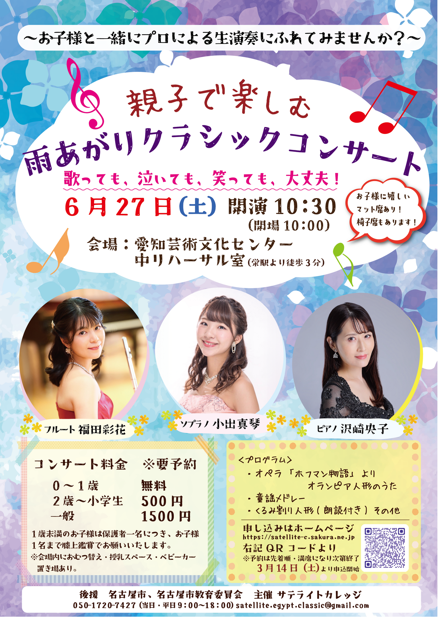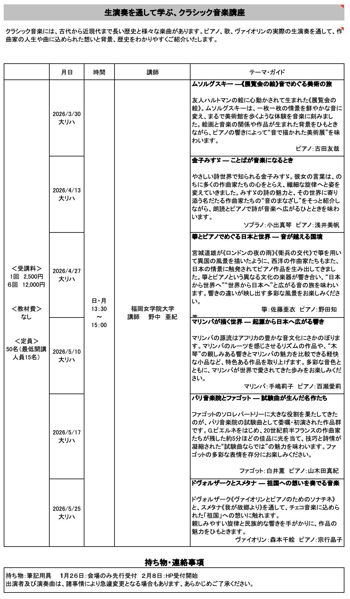 ・親子講座「親子で楽しむ雨あがりクラシックコンサート」の情報をアップしました。申込開始は2026年3月14日(月)からとなります。